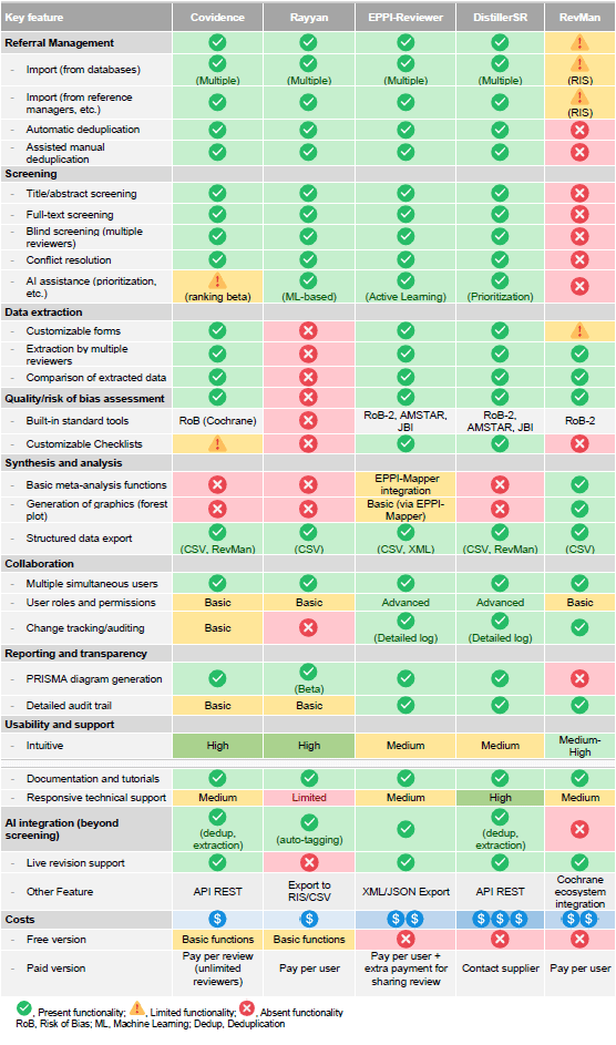 Covidence is widely recognized for its intuitive interface—usually associated with a shorter learning curve— and its capacity to streamline screening and data extraction. As a web-based platform, it facilitates real time collaboration among team members. Its pricing model is based on a per-review fee, allowing unlimited users per project, an advantage for teams with many contributors. Rayyan, in contrast, offers a basic free version (with optional paid) and leverages artificial intelligence to accelerate screening and duplicate detection. It is particularly accessible and integrates well with reference managers. Its paid model is user-based, making it potentially more cost-effective for smaller teams. However, Rayyan lacks built-in functionalities for data extraction and quality assessment, which limits its utility beyond the initial screening phases. Despite these limitations, both Covidence and Rayyan are excellent, low-cost solutions for researchers prioritizing efficiency and collaboration in the early stages of a systematic review. Neither, however, offers meta-analysis capabilities.