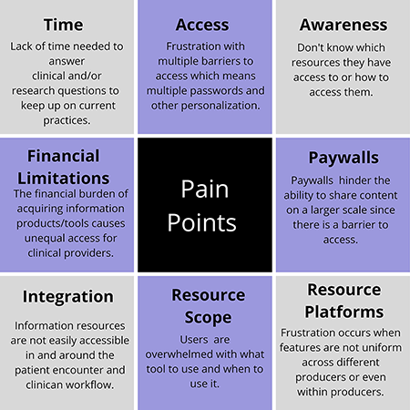 The final pain point is financial limitations, which touches on how financial issues can limit user access to resources [7]. The cost of resources influences access, and decisions regarding resource purchasing or subscriptions greatly impact the availability of specific resources for end users. The financial burden of acquiring information products or tools causes unequal access for clinical providers, a problem mentioned specifically by the EUAB members at nonacademic institutions. Another shared that there was high demand for free, reliable resources among nursing and allied health professionals. Potential solutions for this pain point are tricky because discussing finances is always a sticky subject, but more access can only improve patient care [4, 33]. Librarians in limited financial settings should search out and promote free resources that are accurate. Institutions and publishers need to come together for a more nuanced discussion of pricing for information tools and resources and develop creative solutions that benefit everyone.