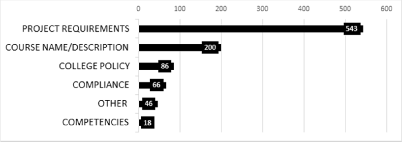 The location of the data within the handbooks was analyzed. A total of 959 DM location-coded extracts were identified across the evaluated handbooks. Project Requirements had the highest number of codes (543), followed by Course Names and Descriptions (200). Other codes were found in fewer than 100 extracts each (College Policy: 86; Compliance: 66; Other: 46; and Competencies: 18). Figure 2 illustrates the total number of codes used to indicate where DM was located within the handbooks.