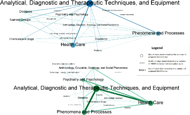 Figure 1 shows two maps of biomedical sciences at the MeSH term level 1 containing sixteen blue nodes/110 edges (upper, co-assignment map) and sixteen green nodes/116 edges (lower, direct citation map). Nodes are level 1 MeSH terms, while edges represent their relationship (i.e., MeSH co-assignments and MeSH citation pairs, respectively). Edge width is proportional to the number of co-assignments or citation pairs between the two MeSH terms, and the node and label sizes are proportional to the number of assignments or citations. The shade of nodes/edges is also based on their size or width, as the color of large nodes or wide edges are darker.