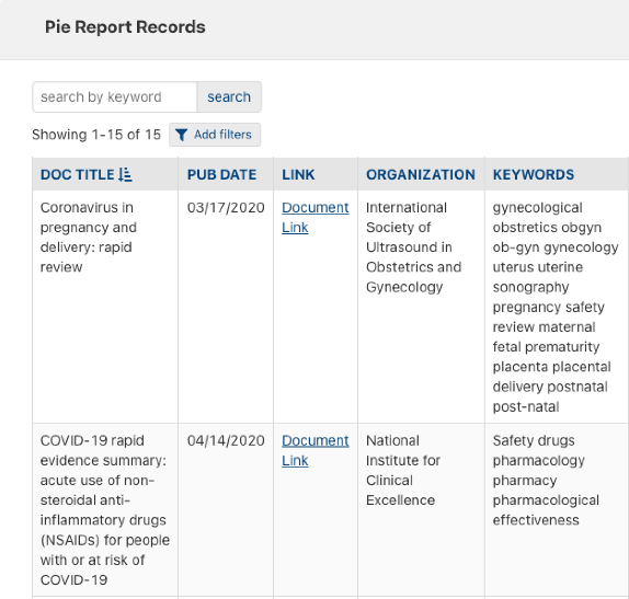 New features continue to be explored, including interactive visual document filtering to further increase ease-of-use and user engagement. The interactive pie charts present users with a method for grouping and filtering documents based on document criteria and search terms of interest (Figure 3). Once the user has created their own pie chart, they can click on any slice in the chart to see the corresponding documents in a table (Figure 4).