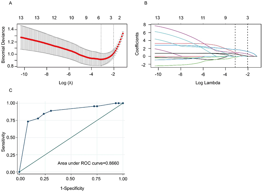 (A) Identification of the optimal penalization coefficient lambda (λ) of the library resource utilization according to Bayesian information criterions. (B) A vertical line was drawn at the optimal λ value, resulting in 5 non-zero coefficients of the library resource utilization. (C) Receiver Operating Characteristic curve (ROC) for factors influencing library resource utilization, AUC = 0.866.