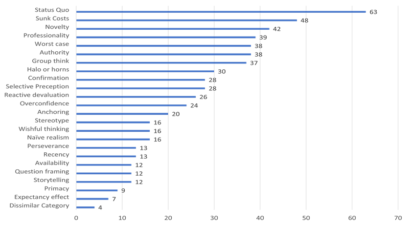 online appendix indicates that a proportionate number of types of leaders participated in this study. Figure 1 graphically portrays the ranked order main results while Table 1 displays them numerically. The top-ranked forms of cognitive bias were: Status Quo, Sunk Costs, Novelty, Professionology, Authority, Worst Case Scenario, and Group Think.