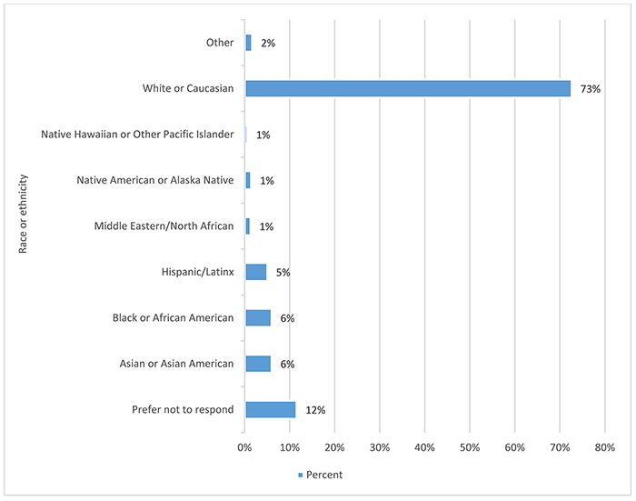 The largest group was “white or Caucasian” at 73%. Figure 3 provides a further breakdown in distribution. There were 14 comments received from this question, most of which focused on more specific groups, like immigrant, South Asian, and Indo-Caribbean.